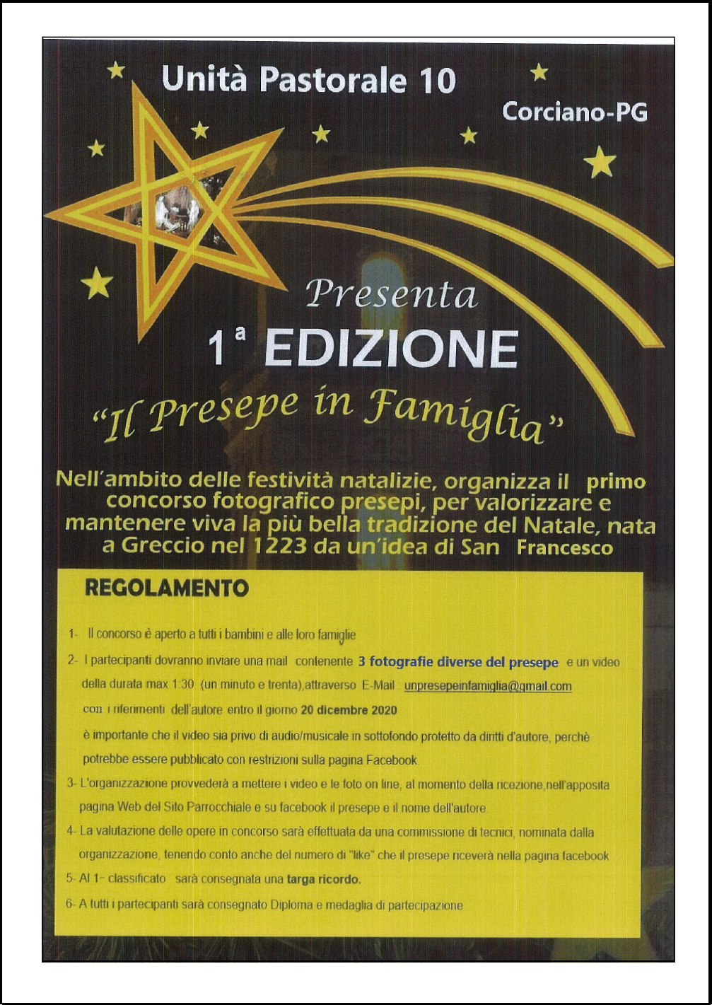 L'Unità Pastorale 10 della Diocesi di Perugia (Parrocchia Maria SS. Assunta di Corciano, Parrocchia San Pietro Apostolo di Chiugiana, Parrocchia San Martino di Fontana, Parrocchia S. Giovanni Apostolo di Olmo organizzano la prima edizione del concorso foto e video “Un Presepe in Famiglia”, presepe che serve per rinascere ancora, perchè "fare il presepe è una scuola di amore e di bellezza".